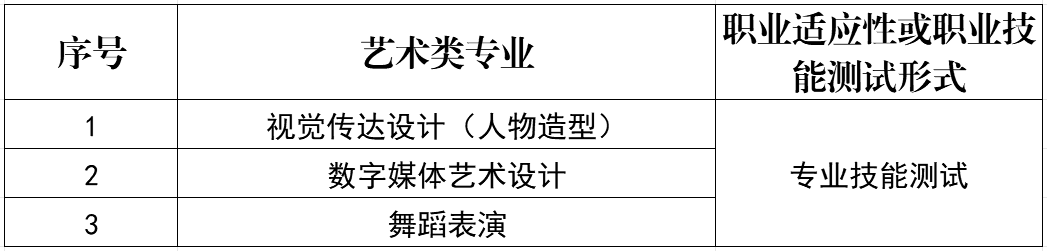 美术类、舞蹈类专业,职业适应性或职业技能测试形式为专业技能测试(考生需自带相关文具或服装,美术考生自带4K画板、纸胶带、铅笔、炭笔、橡皮等素描绘画工具,舞蹈考生自带舞蹈服、配选音乐U盘等)。